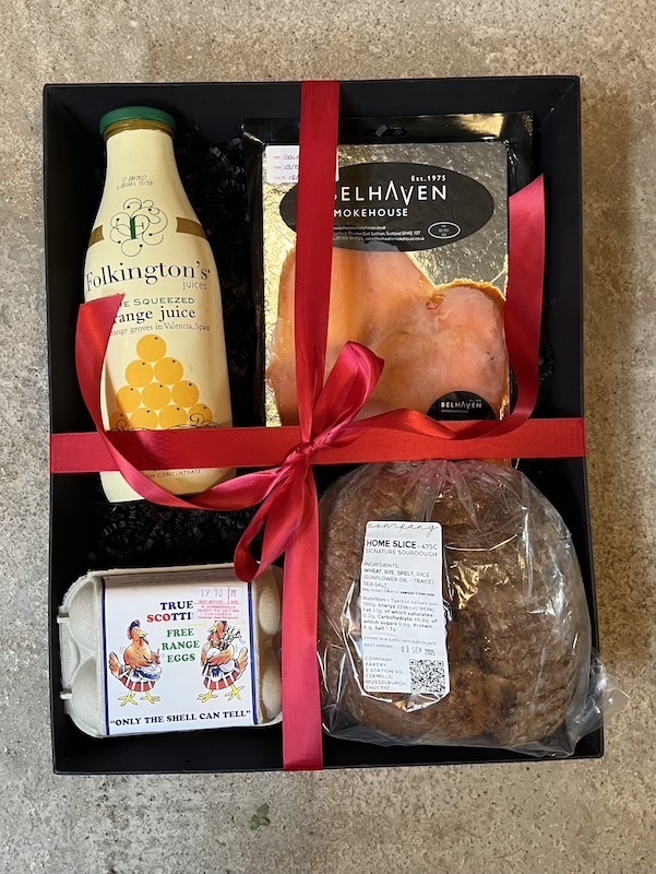 A delicious hamper, serving 4 people, filled with products locally produced in East Lothian, packed in a classic box with ribbon.